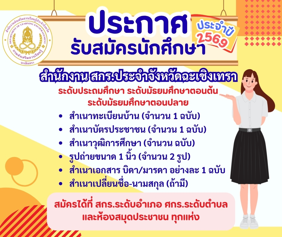 สำนักงาน สกร.ประจำจังหวัดฉะเชิงเทรา รับสมัครนักศึกษา สกร. ปีการศึกษา 2569