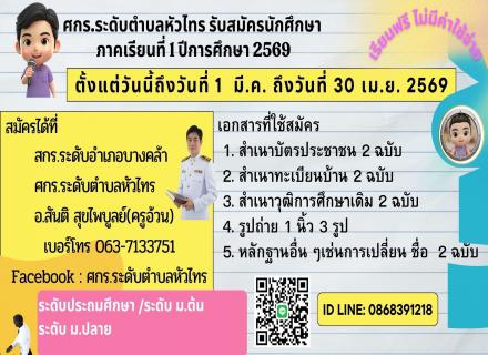 ศกร.ระดับตำบลหัวไทรเปิดรับสมัครนักศึกษา ภาคเรียนที่ 2/2568