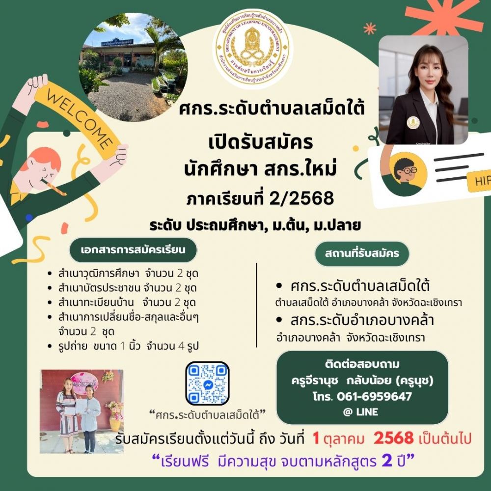 ศกร.ระดับตำบลเสม็ดใต้ รับสมัคร นักศึกษาใหม่ ภาคเรียนที่ 2 ปีการศึกษา 2568