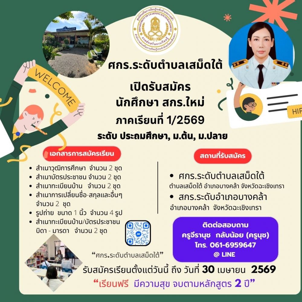 ศกร.ระดับตำบลเสม็ดใต้ รับสมัคร นักศึกษาใหม่ ภาคเรียนที่ 2 ปีการศึกษา 2568