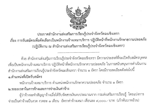 หมวดหมู่ : ข่าวประชาสัมพันธ์ หัวข้อเรื่อง : ประกาศสำนักงานส่งเสริมการเรียนรู้ประจำจังหวัดฉะเชิงเทรา เรื่อง การรับสมัครเพื่อคัดเลือกเป็นพนักงานจ้างเหมาบริการ ปฏิบัติหน้าที่พนักงานรักษาความปลอดภัย (ปฏิบัติงาน ณ สำนักงานส่งเสริมการเรียนรู้ประจำจังหวัดฉะเชิงเทรา)