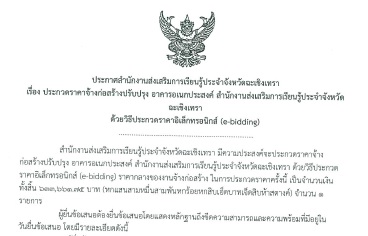 หัวข้อเรื่อง : ประกาศสำนักงานส่งเสริมการเรียนรู้ประจำจังหวัดฉะเชิงเทรา เรื่อง ประกวดราคาจ้างก่อสร้างปรับปรุง อาคารอเนกประสงค์ สำนักงานส่งเสริมการเรียนรู้ประจำจังหวัดฉะเชิงเทรา ด้วยวิธีประกวดราคาอิเล็กทรอนิกส์ (e-bidding)