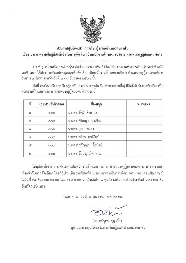 ประกาศรายชื่อผู้มีสิทธิ์เข้ารับการคัดเลือกเป็นพนักงานจ้างเหมาบริการ ตำแหน่งครูผู้สอนคนพิการ