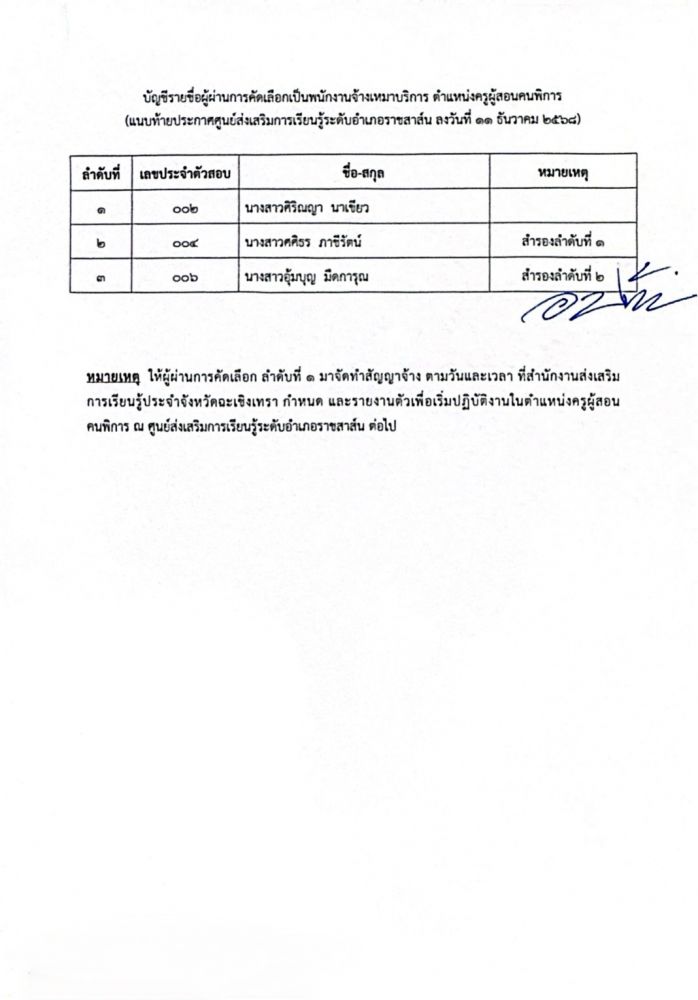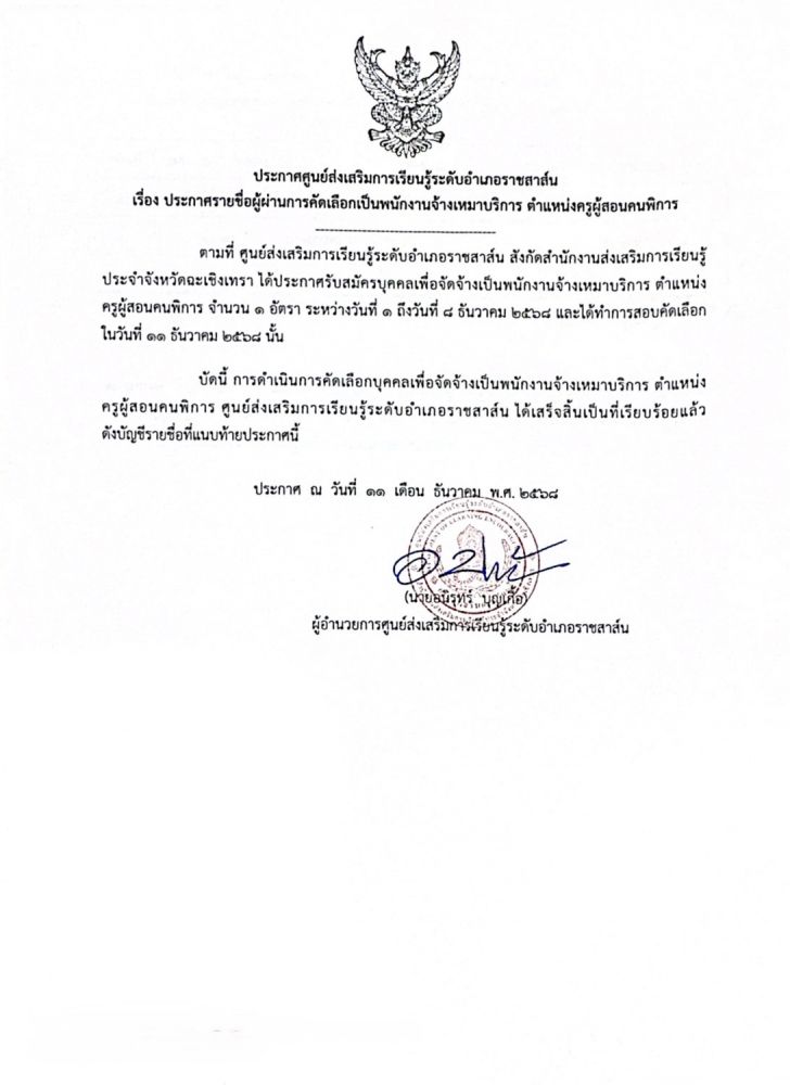 ประกาศศูนย์ส่งเสริมการเรียนรู้ระดับอำเภอราชสาส์นเรื่อง ประกาศรายชื่อผู้ผ่านการคัดเลือกเป็นพนักงานจ้างเหมาบริการ ตำแหน่งครูผู้สอนคนพิการ